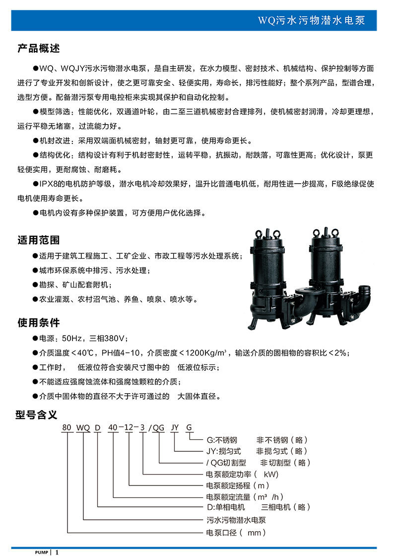 產品說明:南方WQ污水污物潛水電泵由電機與泵兩部分組成,兩者通過油室及機械密封組件隔開,分固定式自動耦合安裝和移動安裝。