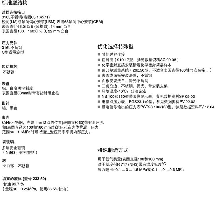 2. 膜片壓力表,化學(xué)工業(yè)型,表頭不充液/充液,高過(guò)壓保護(hù)壓力表,針對(duì)UHP應(yīng)用:422.12 432.50 432.56 423.36 423.25