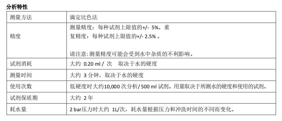 此分析裝置只能用于確定水樣總硬度或碳酸鹽硬度。只有使用廠家推薦的試劑和配件才能保證正確的操作。