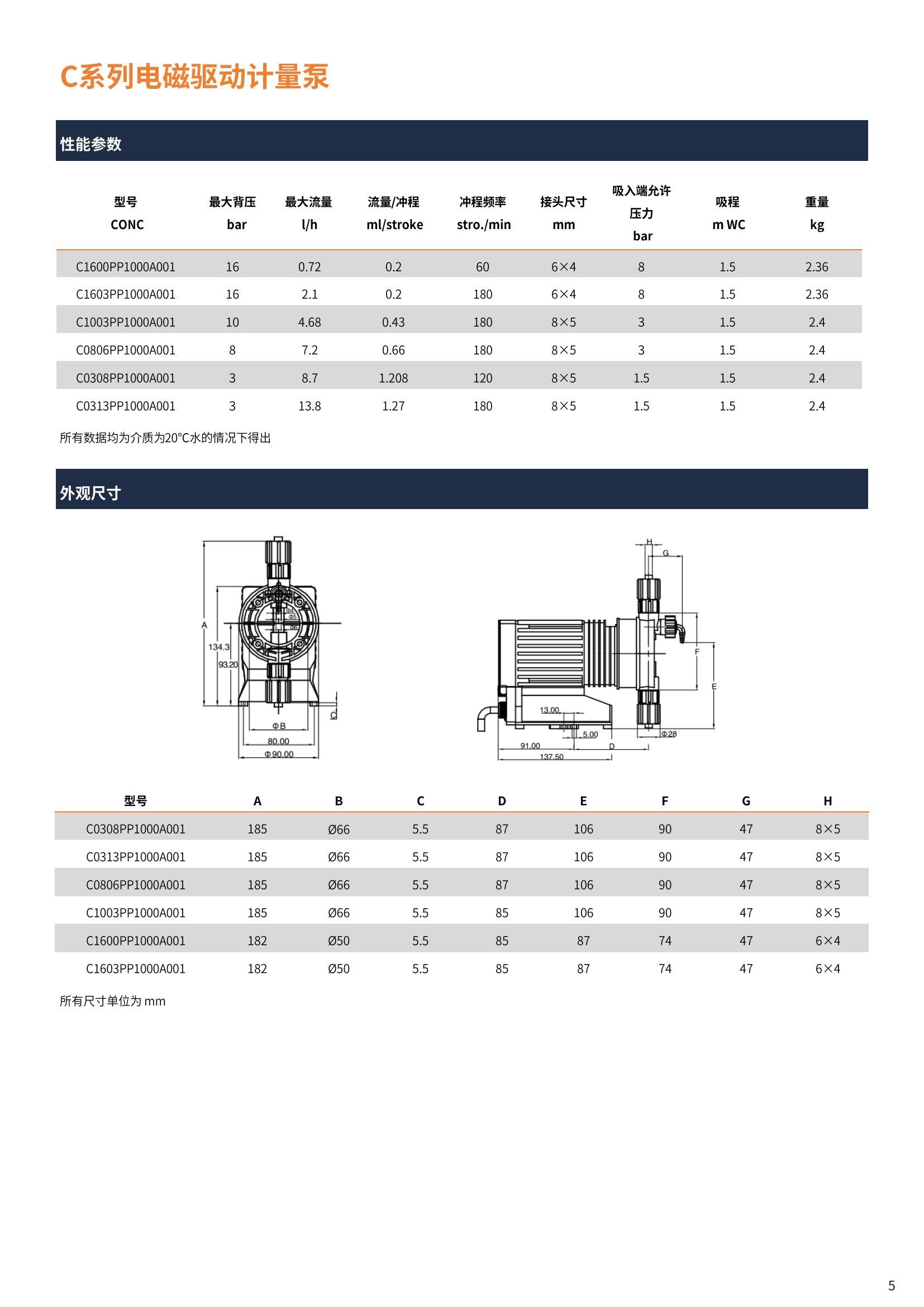 | CONCEPT c系列 計量泵型號 | *大背壓下的計量能力 | 沖程頻率 | 接口尺寸 外徑X內徑 | 吸入端允許 入口壓力 | 功率 | 重量 | ||