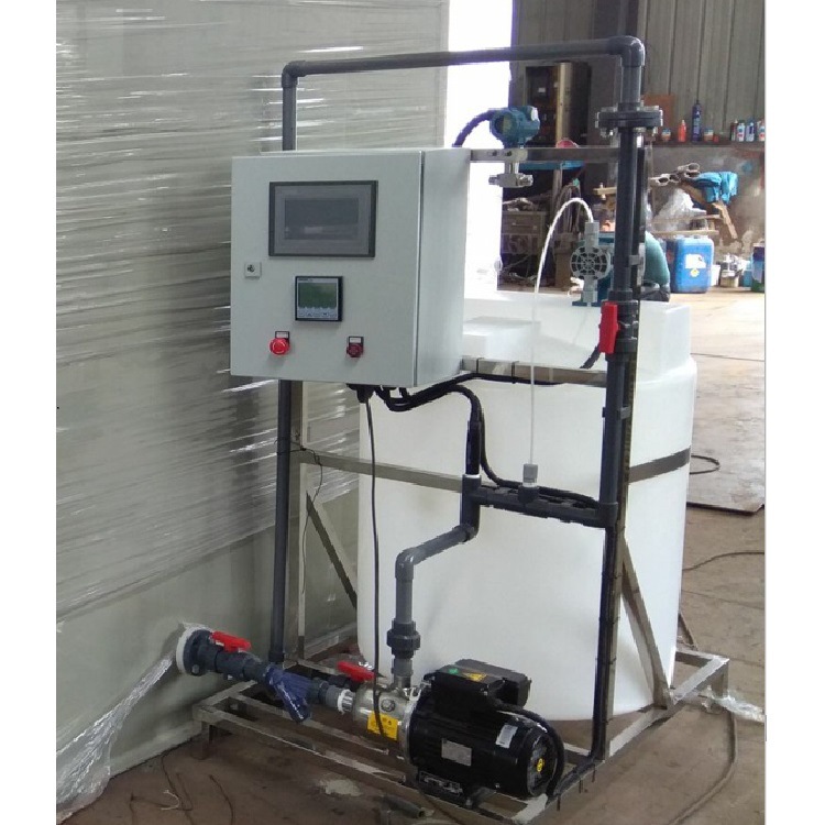 加藥裝置通過不同的工藝設計,配置各類固體和液體的化學藥品的溶液,再用計量泵準確投加,以達到各種設計要求。如除垢、除氧、混凝、加酸、加堿等。