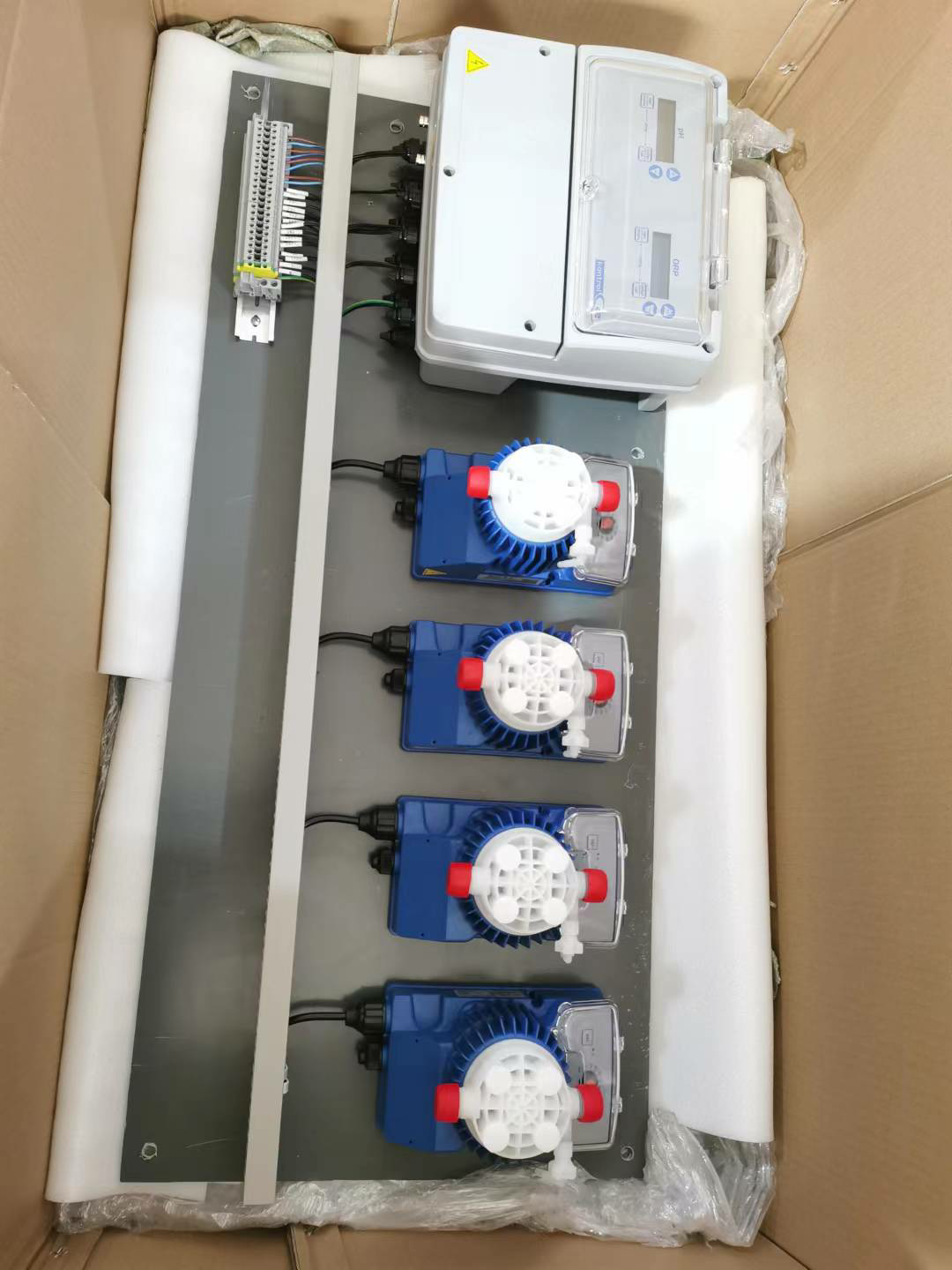 三臺或者四臺加藥計量泵可選,投加絮凝劑計量泵, 加酸計量泵,加氯計量泵和除藻劑加藥泵。