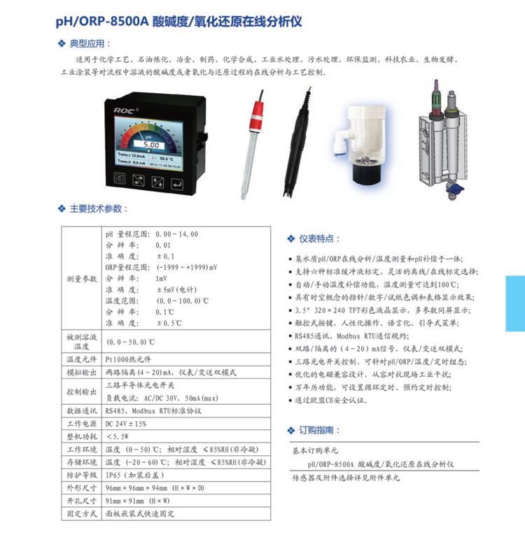 pH/ORP-8500A酸堿度/氧化還原在線分析儀是集pH/ORP/溫度測(cè)量于一體的高準(zhǔn)確度、高性價(jià)比的酸堿度/氧化還原電位變送控制儀表,以32位ARM處理器為核心的強(qiáng)大內(nèi)核與操作系統(tǒng),使得信息處理速度和測(cè)量準(zhǔn)確且穩(wěn)定,在儀表行業(yè)率先采用大型彩色屏幕的多參數(shù)同屏幕顯示。