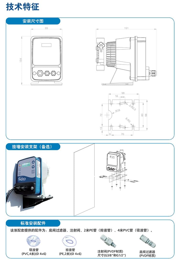 電磁隔膜計量泵主要特征: 大壓力:10bar; 大流量:9升/小時;泵頭材質:PVDF