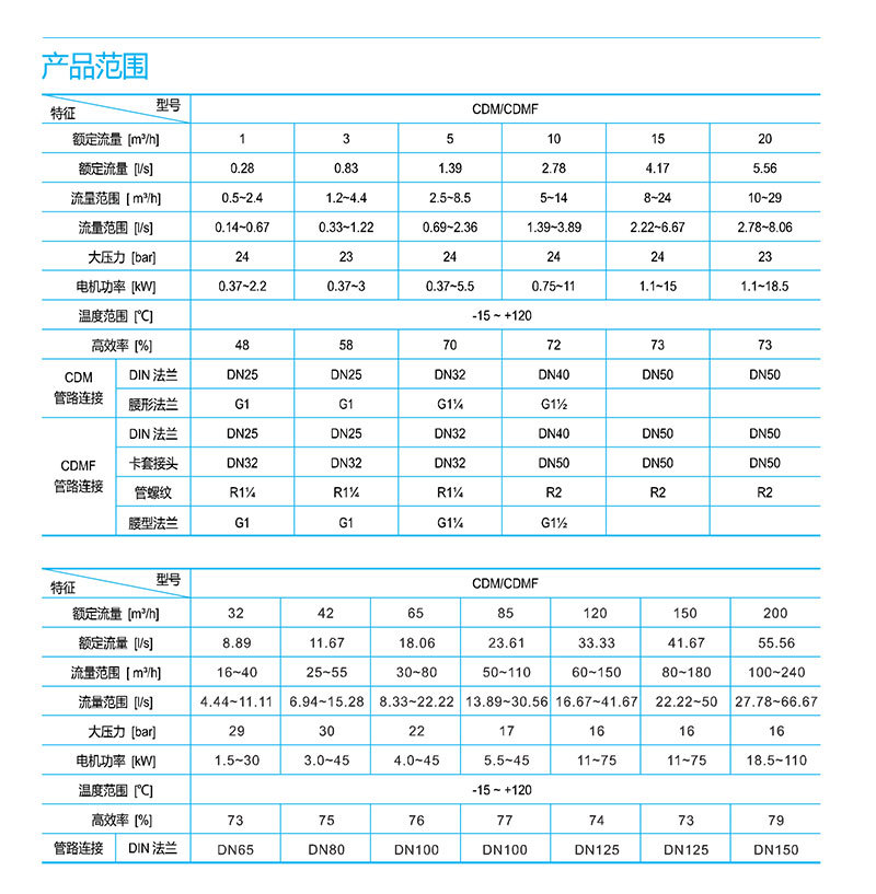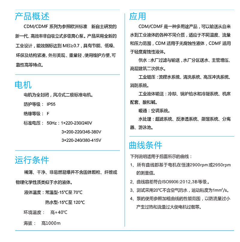 南方CDM/CDMF系列為參照歐洲標準新自主研發的新一代、高效率非自吸立式多級離心泵。產品采用全新的工業設計,能效指標達到MEI≥0.7,具有節能、低噪、環保及機構緊湊、外觀美觀、重量輕、使用維護方便、可靠性高等特點。