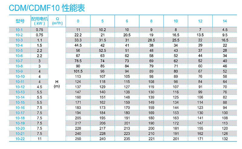 型號 | 揚程 | 功率 | 級數 | 電機功率 | 重量 |