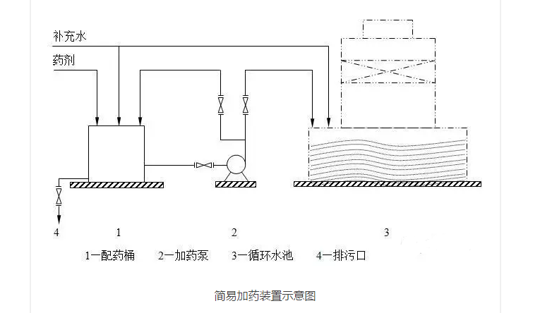 藥劑加入集水池中不要靠近排水口,以免藥劑不進入循環水系統就被直接排走;藥劑在池中要有一個混合的時間,使其混合均勻;不要靠近某一臺泵的入口加藥,這樣會造成藥劑濃度分布不均勻。